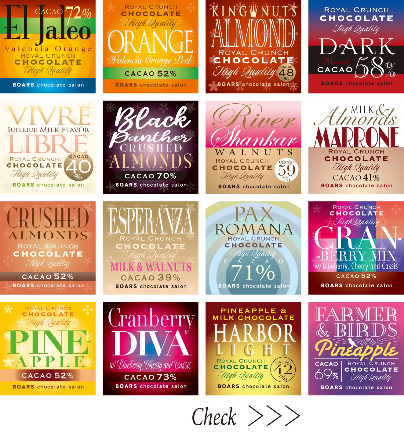 ROYAL CRUNCH CHOCOLATE商品のご案内 【通常商品】 シンプル&ベーシック、カカオ分48%のポピュラーなタイプ。クーベルチュール・チョコレートの本格派で濃厚な味わいと、香りの良いフレッシュバターを使ったフレーク状の薄焼きクッキーの絶妙なミックス。小さなお子様からご年配の方まで幅広くお楽しみ頂けます。 【特別商品】 個性を持ったさまざまなロイヤルクランチ・チョコレートたち。ナッツやドライフルーツを盛り込んだり、国内外で珍しい希少価値の高いクーベルチュールで、コーヒーや高級紅茶、洋酒などとよく合う香りと味を、季節や雰囲気に合わせた味比べをお楽しみ下さい。発売時には公式SNS等でお知らせも。
