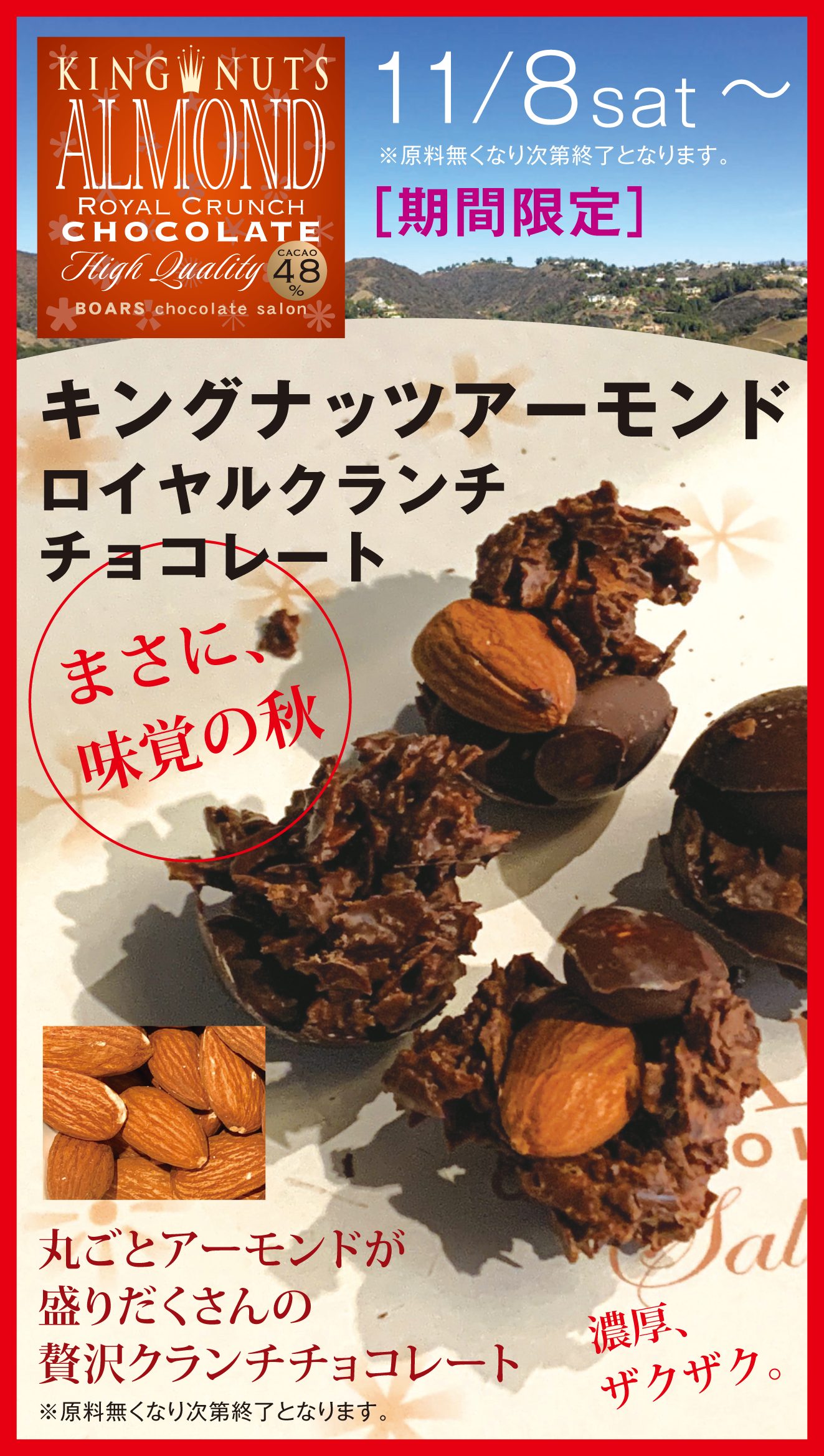 NEWSお知らせ/詳細 2025.10.31 濃厚チョコレートで全コーティングした丸ごとアーモンド1~3粒/個 と、サクサク薄焼きクッキーフレークの贅沢クランチ・チョコレート。 レギュラーサイズ(95g)税込2,700円 ライトサイズ(57g)税込1,890円 ミニサイズ(38g)税込1,350円 本品は「リッチアーモンド・ロイヤルクランチ・チョコレート」から製品名改称致しました。 【ご予約について】 店頭ご注文のみお承り致しております。 ※電話・Eメール等でのご予約を承っておりません。