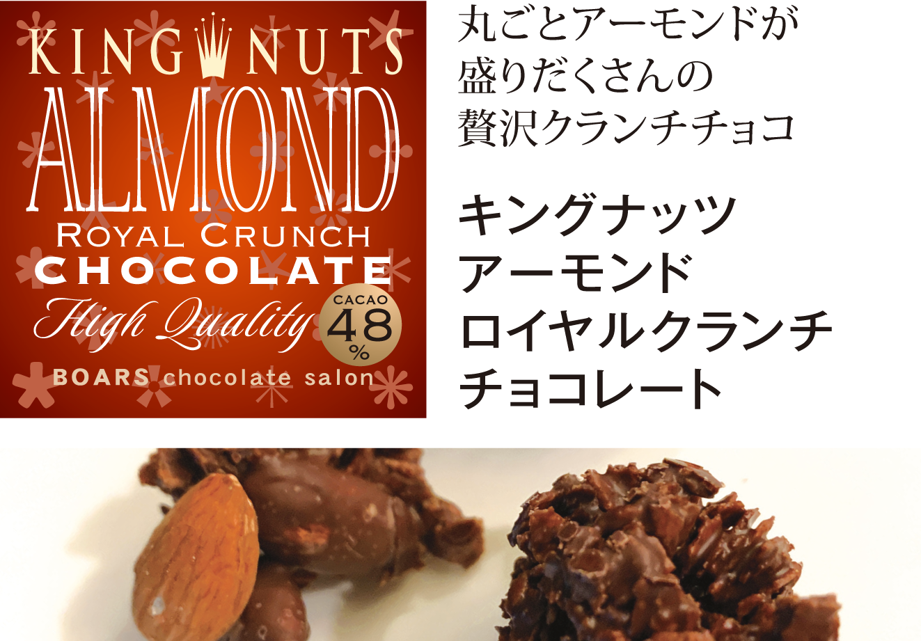 ハイカカオ・クーベルチュール(ガーナ産)と、クラッシュアーモンドで、「高級感&ワイルド感」を同時に楽しめるロイヤルクランチ・チョコレート。